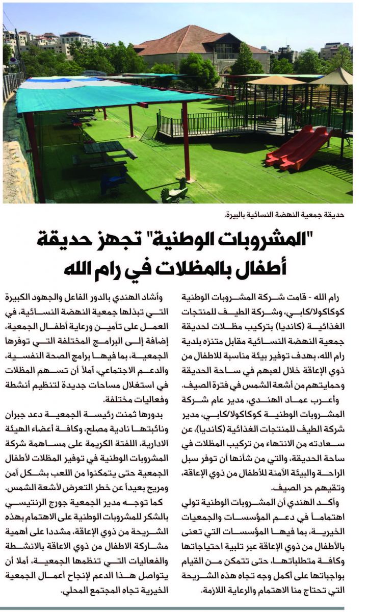 المشروبات الوطنية" تجهز حديقة أطفال بالمظلات في رام الله"