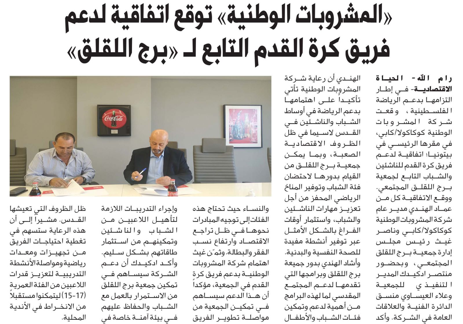 المشروبات الوطنية توقع اتفاقية لدعم فريق كرة القدم التابع ل برج اللقلق