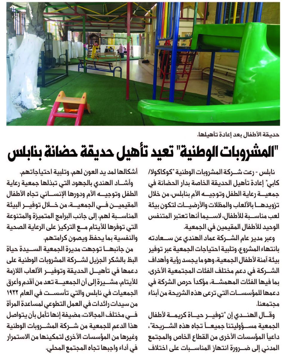 المشروبات الوطنية تعيد تاهيل حديقة حضانة بنابلس