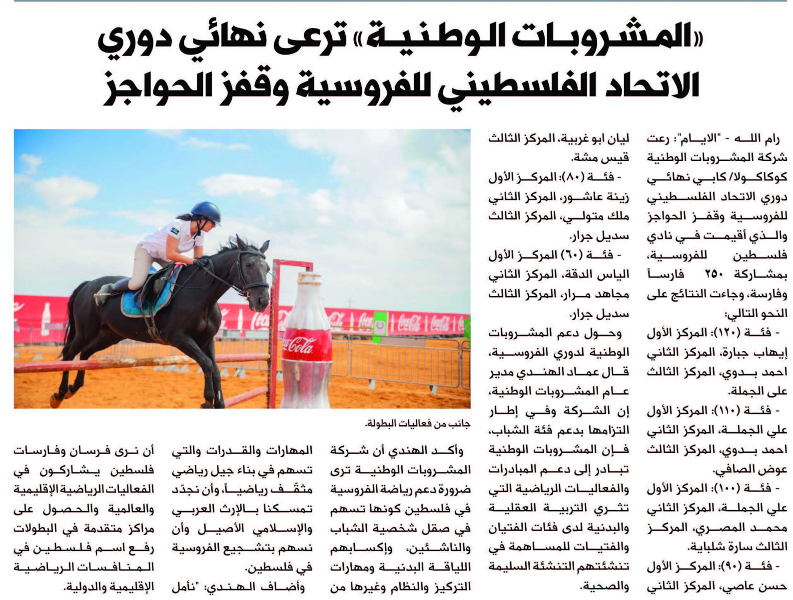 المشروبات الوطنية ترعى نهائي دوري الاتحاد الفلسطيني للفروسية و قفز الحواجز