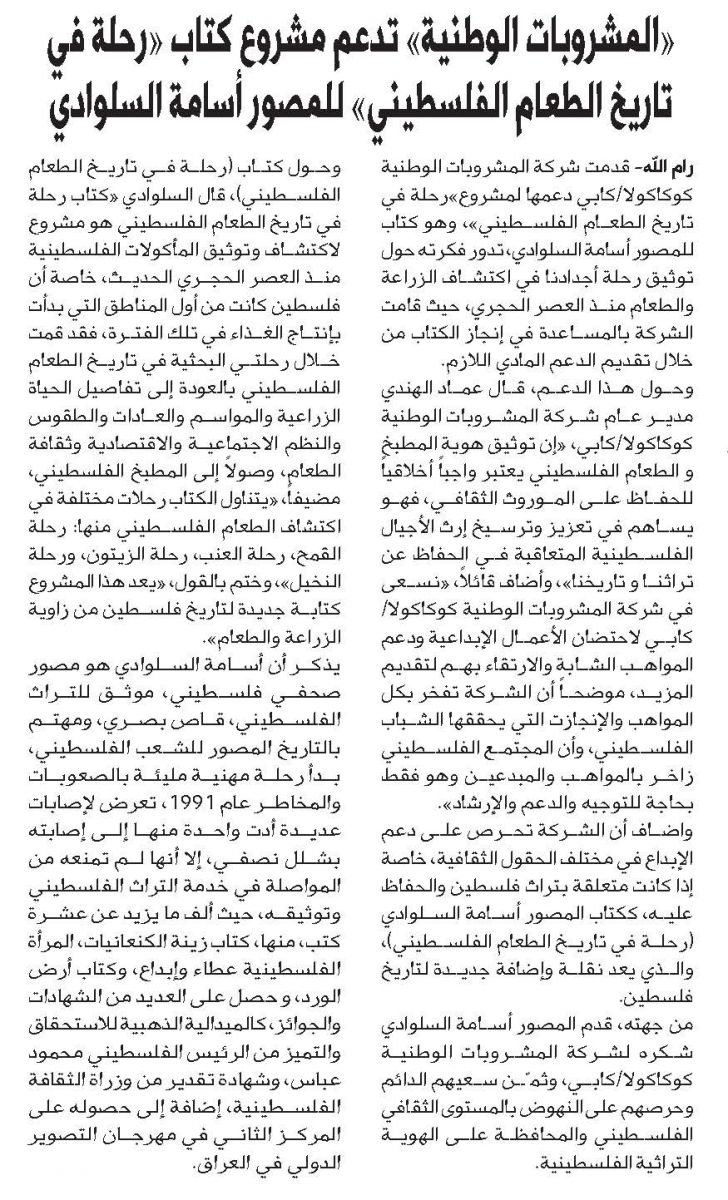 المشروبات الوطنية تدعم مشروع كتاب "رحلة في تاريخ الطعام الفلسطيني" للمصور اسامة السلوادي