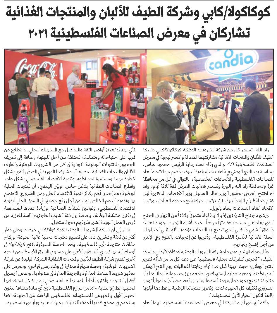 كوكاكولا/كابي وشركة الطيف للألبان والمنتجات الغذائية تشاركان في معرض الصناعات الفلسطينية