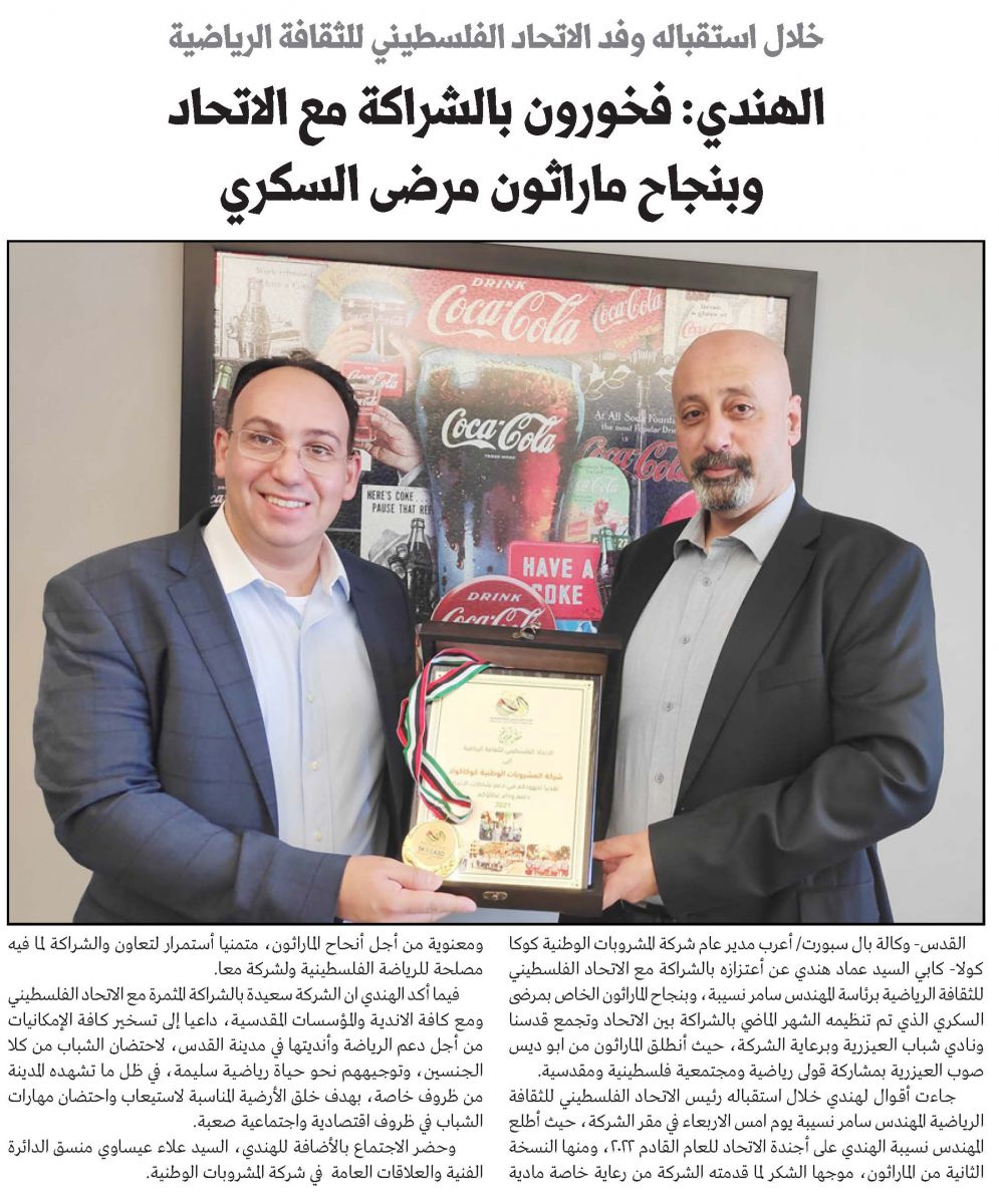 خلال استقباله وفد الاتحاد الفلسطيني للثقافة الرياضية الهندي: فخورون بالشراكة مع الاتحاد وبنجاح ماراثون مرضى السكري