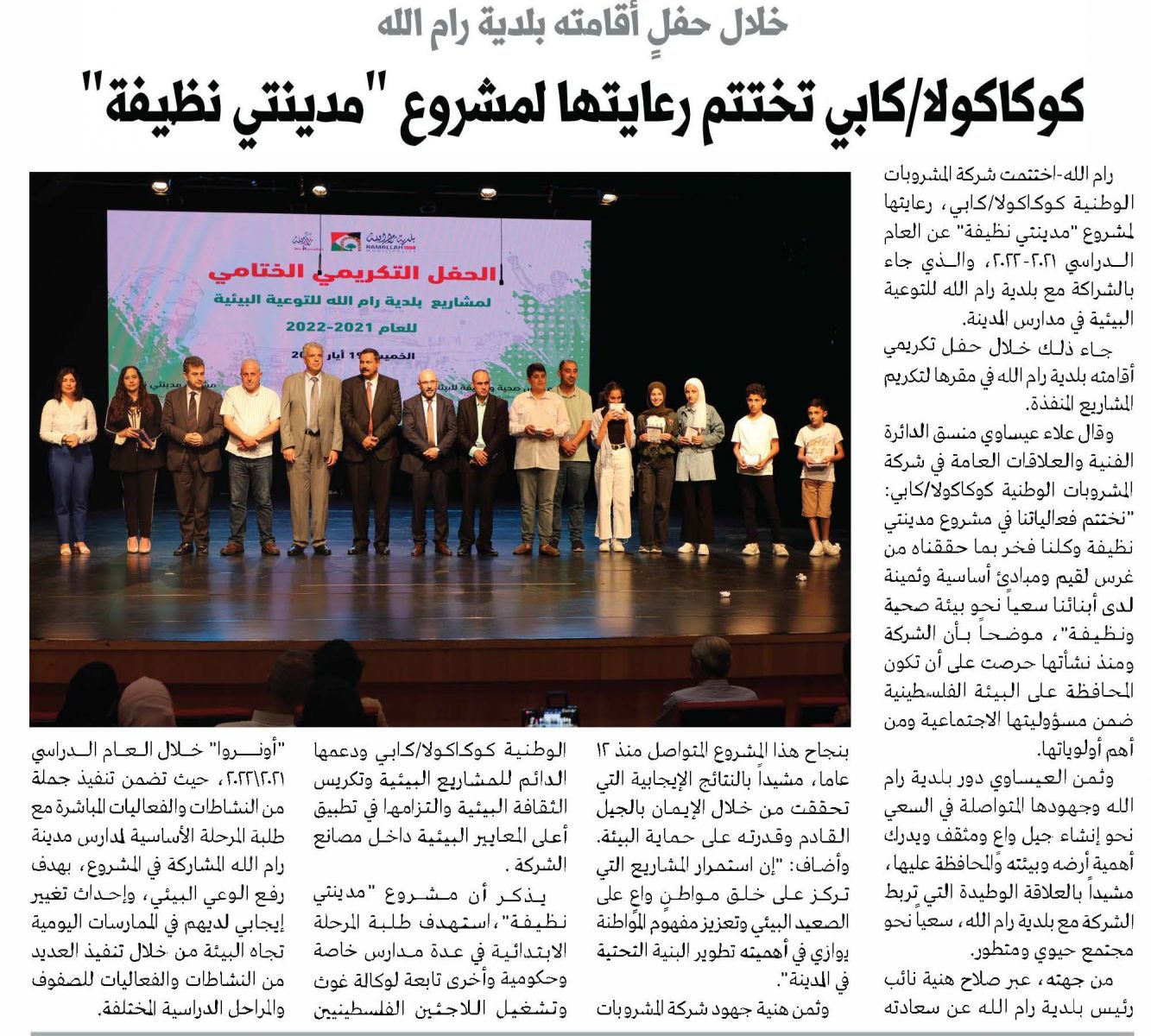 خلال حفل اقامته بلدية رام الله، كوكا كولا\كابي تختتم رعايتها لمشروع (مدينتي نظيفة)