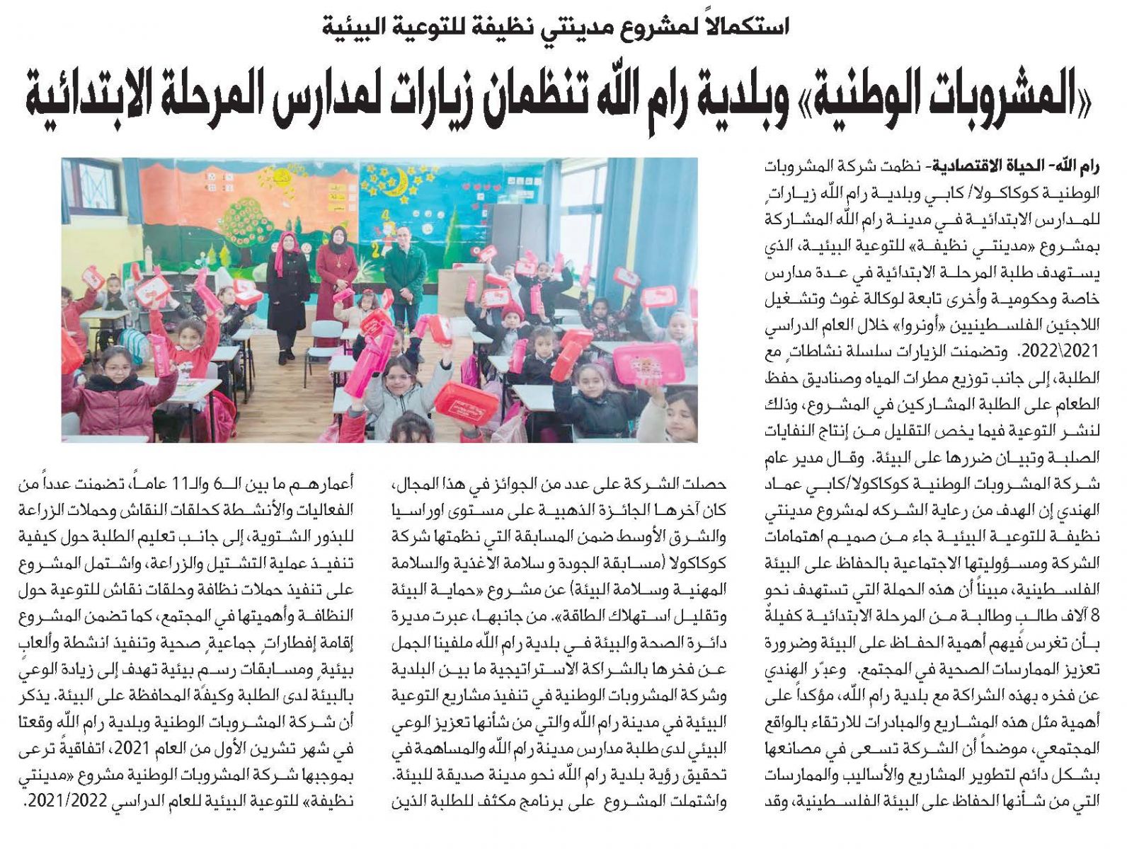 استكمالا لمشروع مدينتي نظيفة للتوعية البيئية.. "المشروبات الوطنية" وبلدية رام الله تنظمان زيارات لمدارس المرحلة الابتدائية