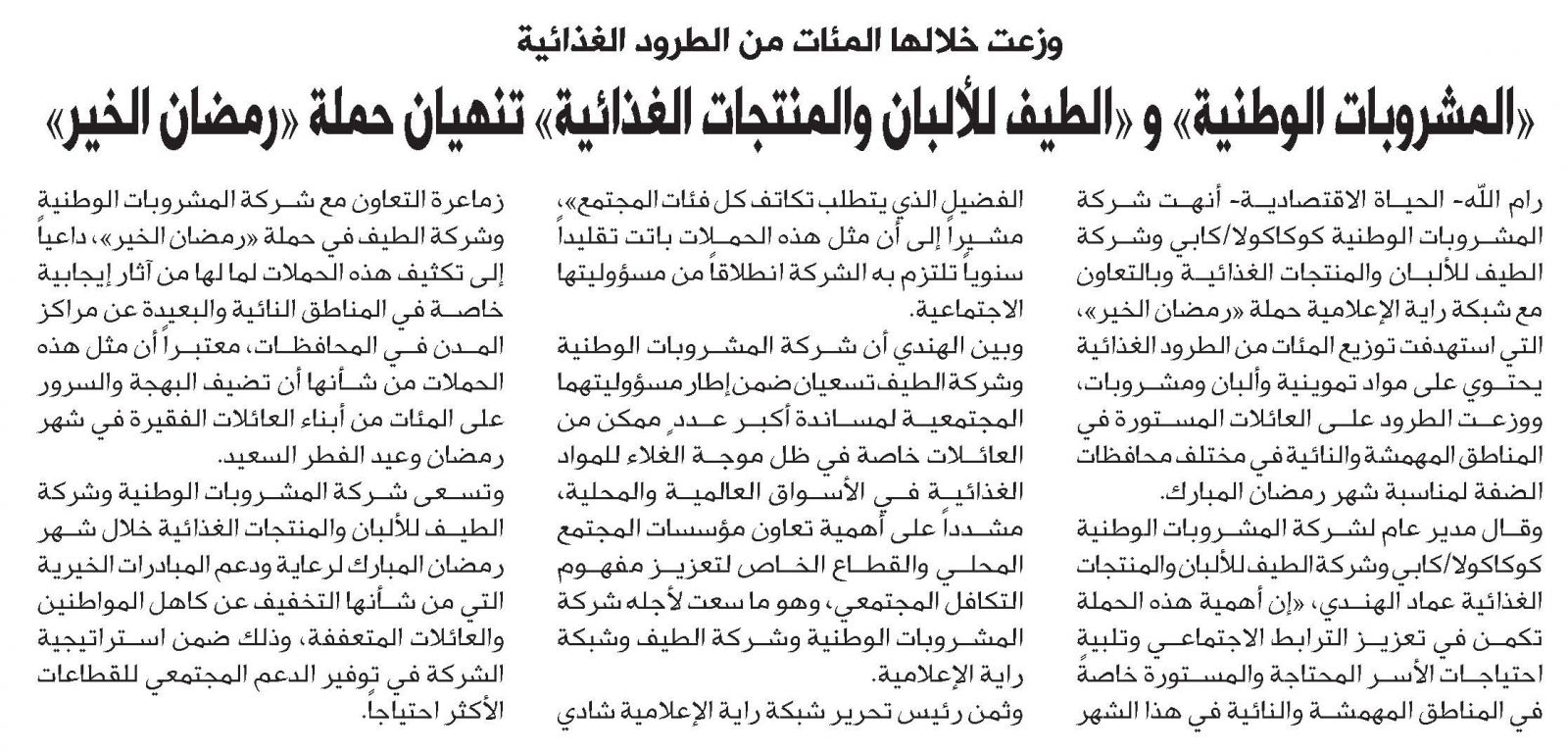 "وزعت خلالها المئات من الطرود الغذائية «المشروبات الوطنية » و «الطيف للألبان والمنتجات الغذائية » تنهيان حملة "رمضان الخير
