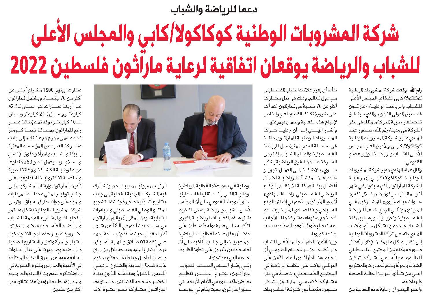 دعما للرياضة والشباب شركة المشروبات الوطنية كوكاكولا/كابي والمجلس الأعلى للشباب والرياضة يوقعان اتفاقية لرعاية ماراثون فلسطين 2022