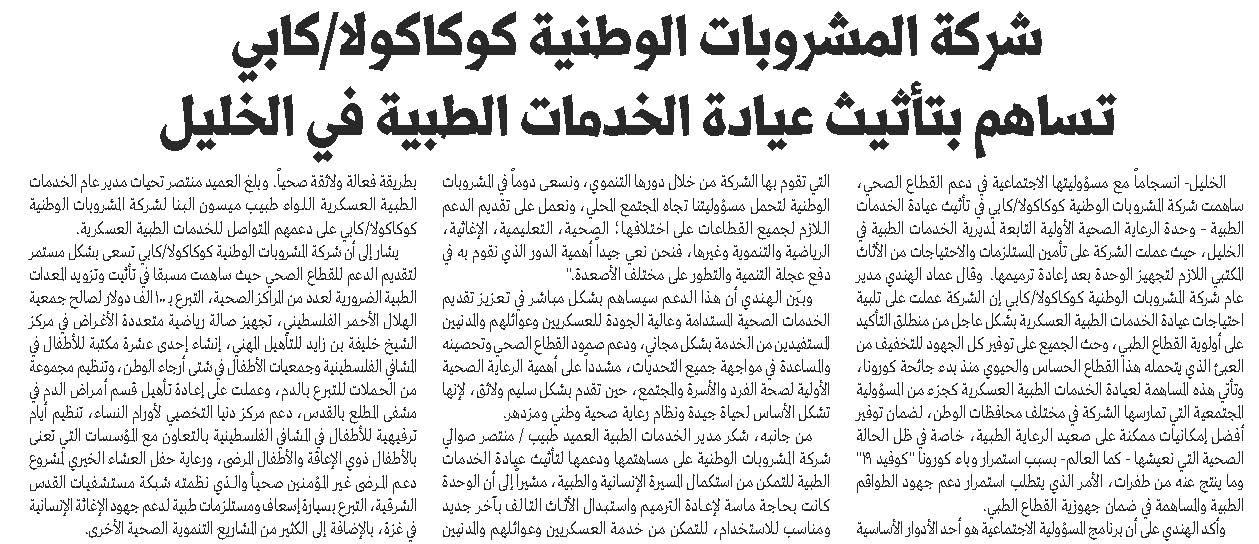 شركة المشروبات الوطنية كوكاكولا/كابي تساهم بتأثيث عيادة الخدمات الطبية في الخليل