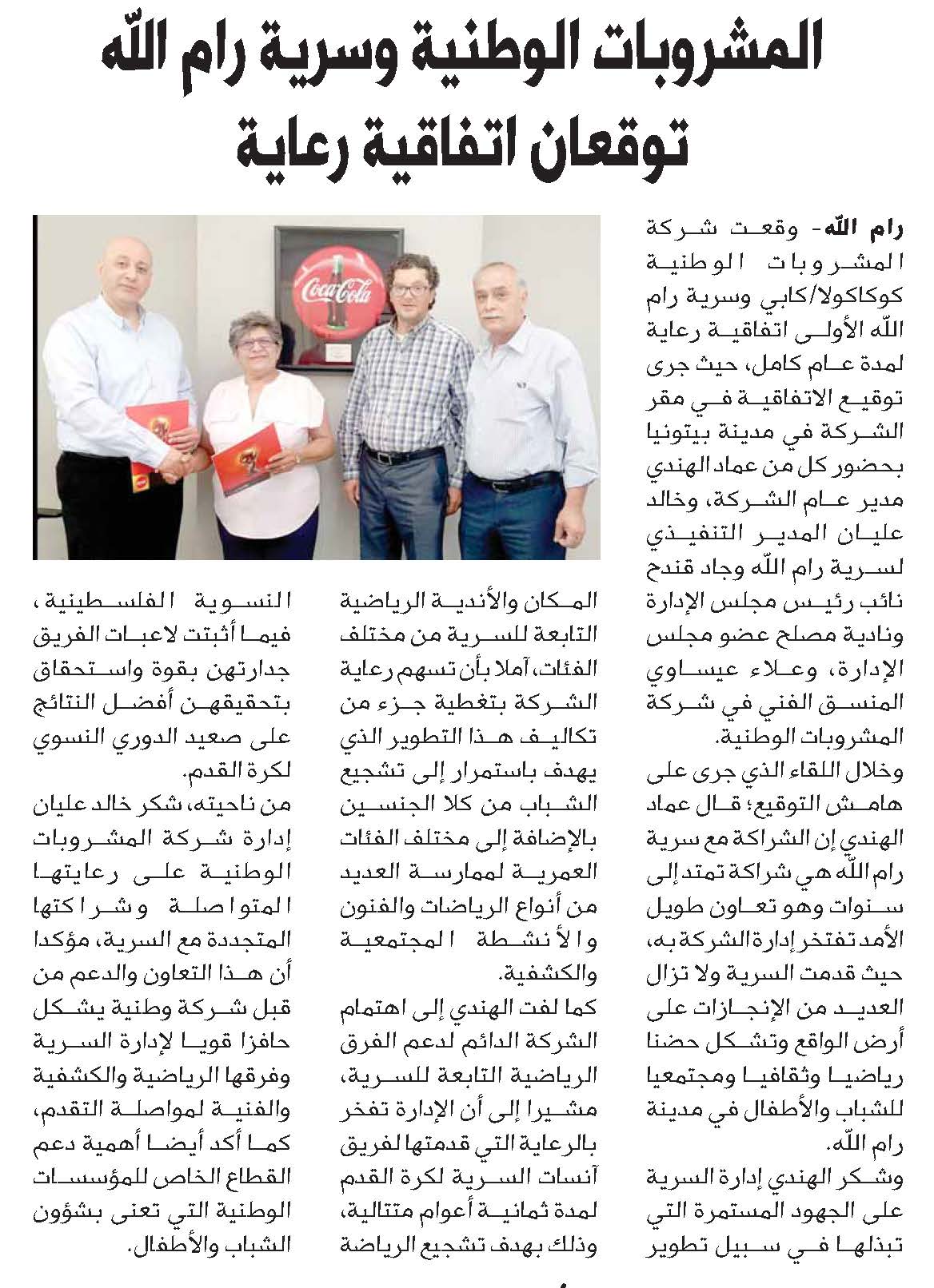 المشروبات الوطنية وسرية رام الله توقعان اتفاقية رعاية