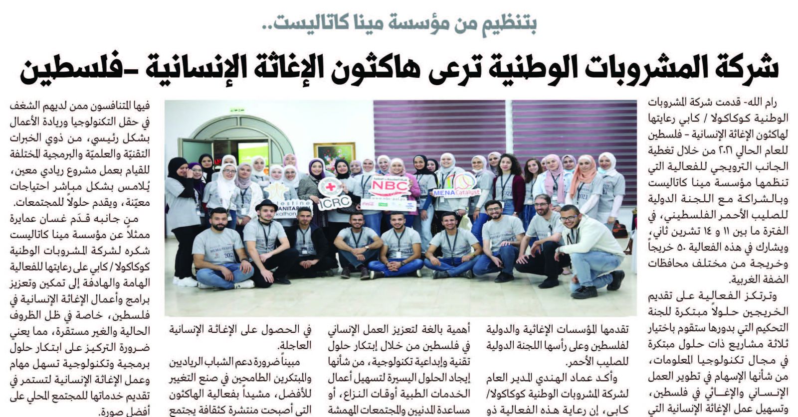 بتنظيم من مؤسسة مينا كاتاليست... شركة المشروبات الوطنية ترعى هاكثون الاغاثة الانسانية - فلسطين
