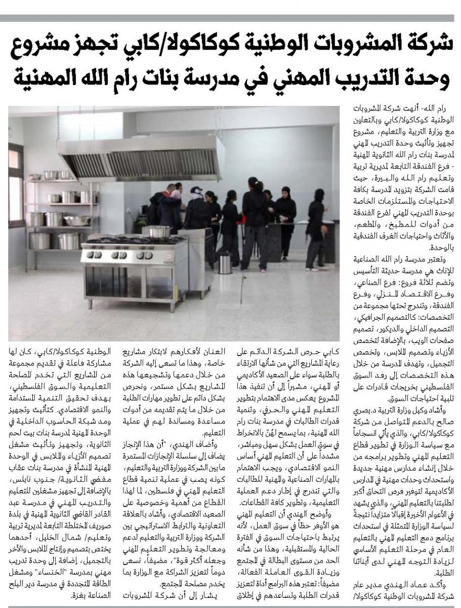 شركة المشروبات الوطنية كوكاكولا / كابي تجهز مشروع وحدة التدريب المهني في مدرسة بنات رام الله المهنية