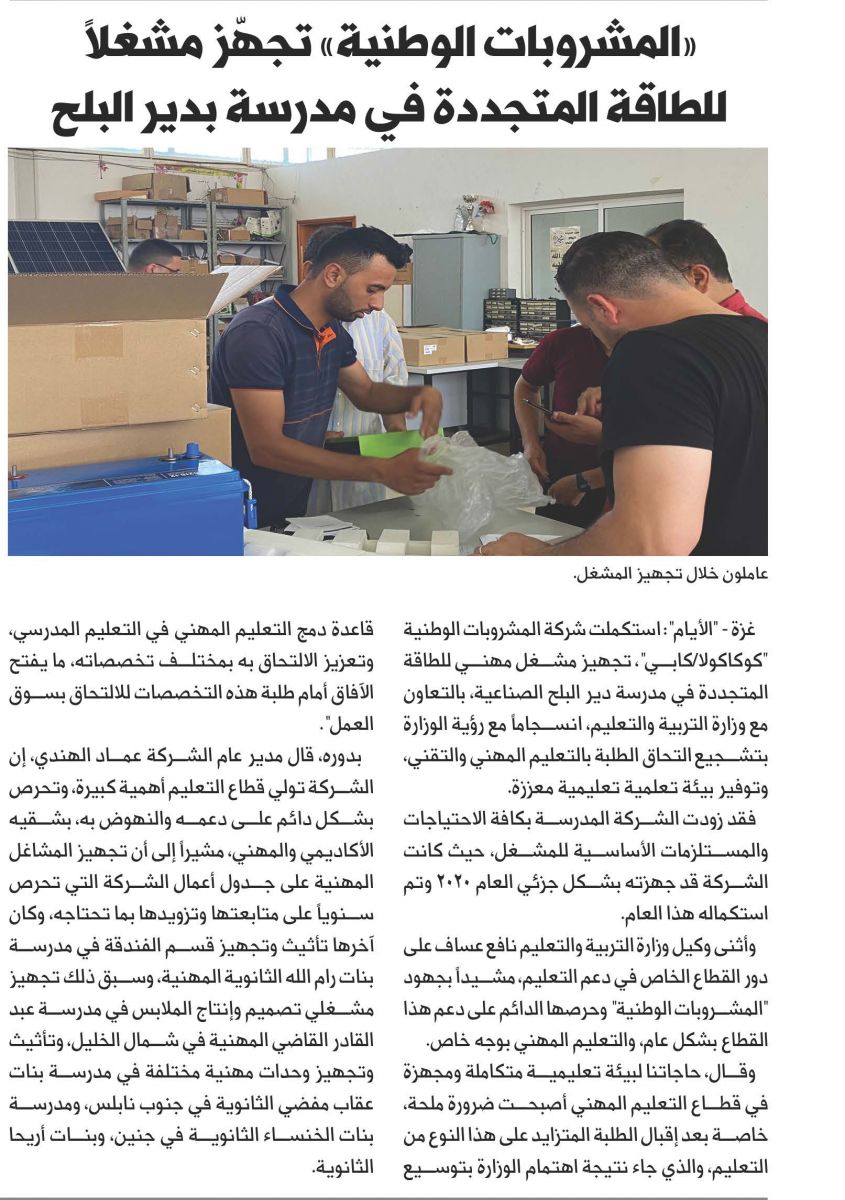 "المشروبات الوطنية " تجهز مشغلا للطاقة المتجددة في مدرسة دير البلح