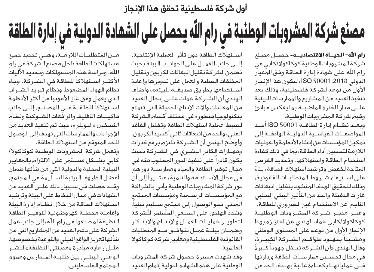 مصنع شركة المشروبات الوطنية في رام الله يحصل على الشهادة الدولية في إدارة الطاقة