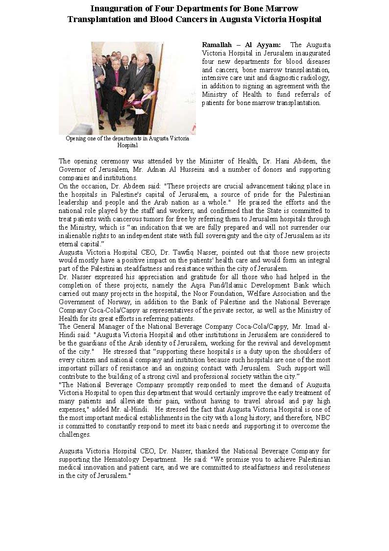 Inauguration of Four Departments for Bone Marrow Transplantation and Blood Cancers in Augusta Victoria Hospital