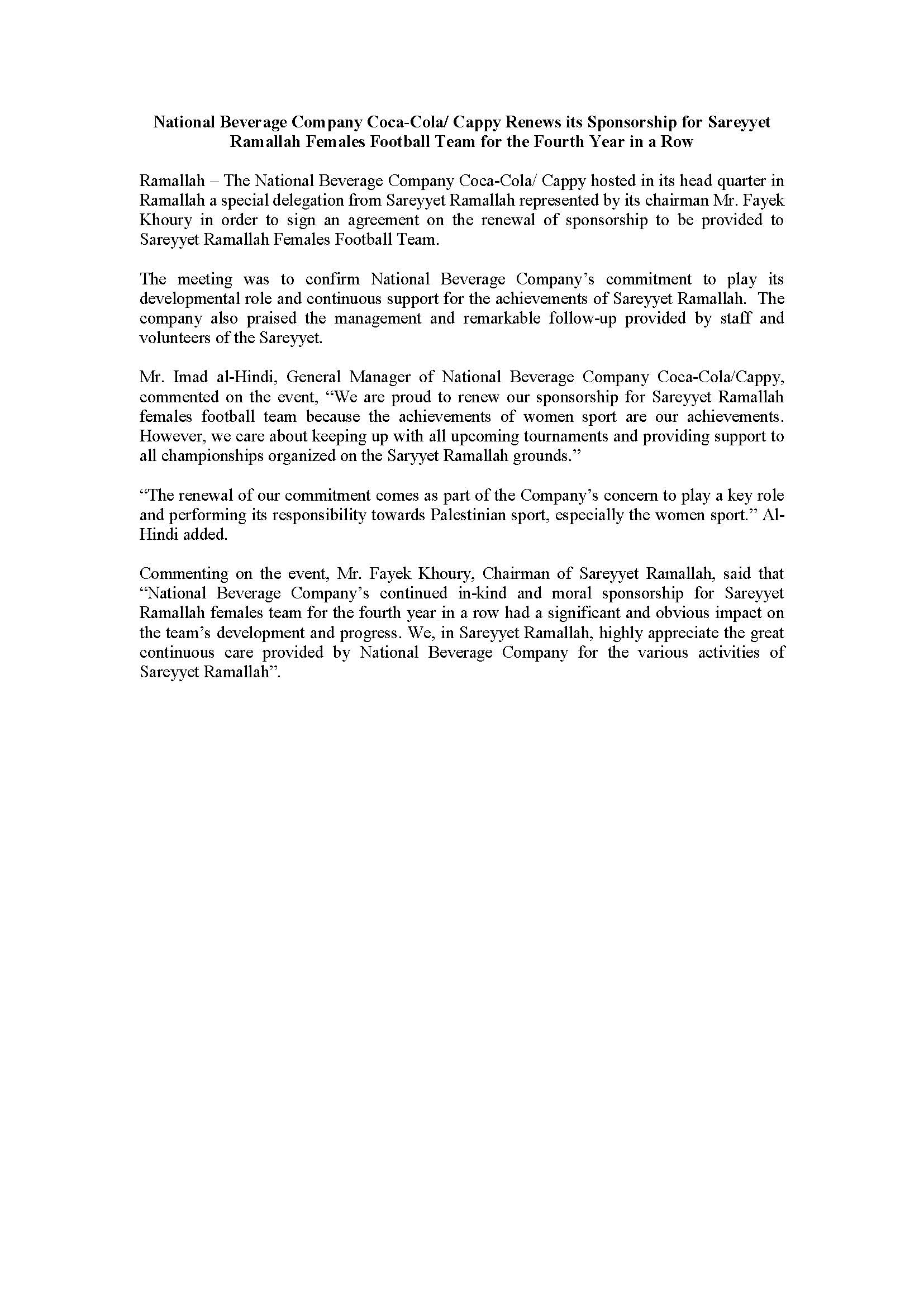 National Beverage Company Coca-Cola/ Cappy Renews its Sponsorship for Sareyyet Sareyyet Ramallah Females Football Team for the Fourth Year in a Row