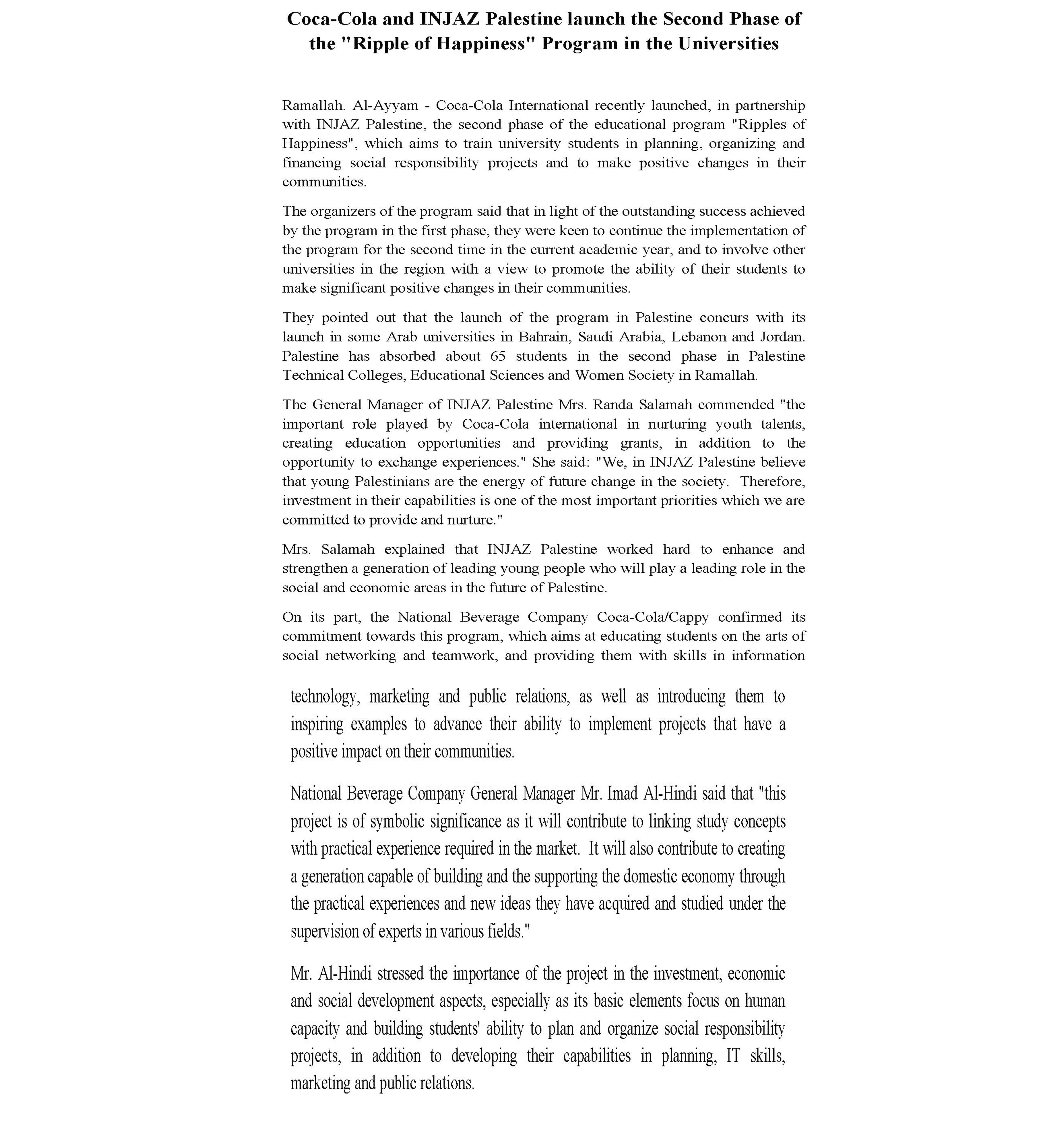 Coca-Cola and INJAZ palestine launch the second phase of the ripple of happiness program in the universities