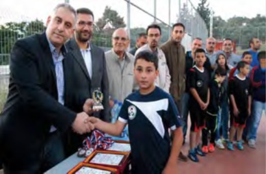 Captain of Beit Naqouba Team receives the Trophy Cup of the Champion from Mr. Wael Zaghal, NBC Representative and Abdulla Al-Kiswani, President of Jabal Al-Zaytoon Club