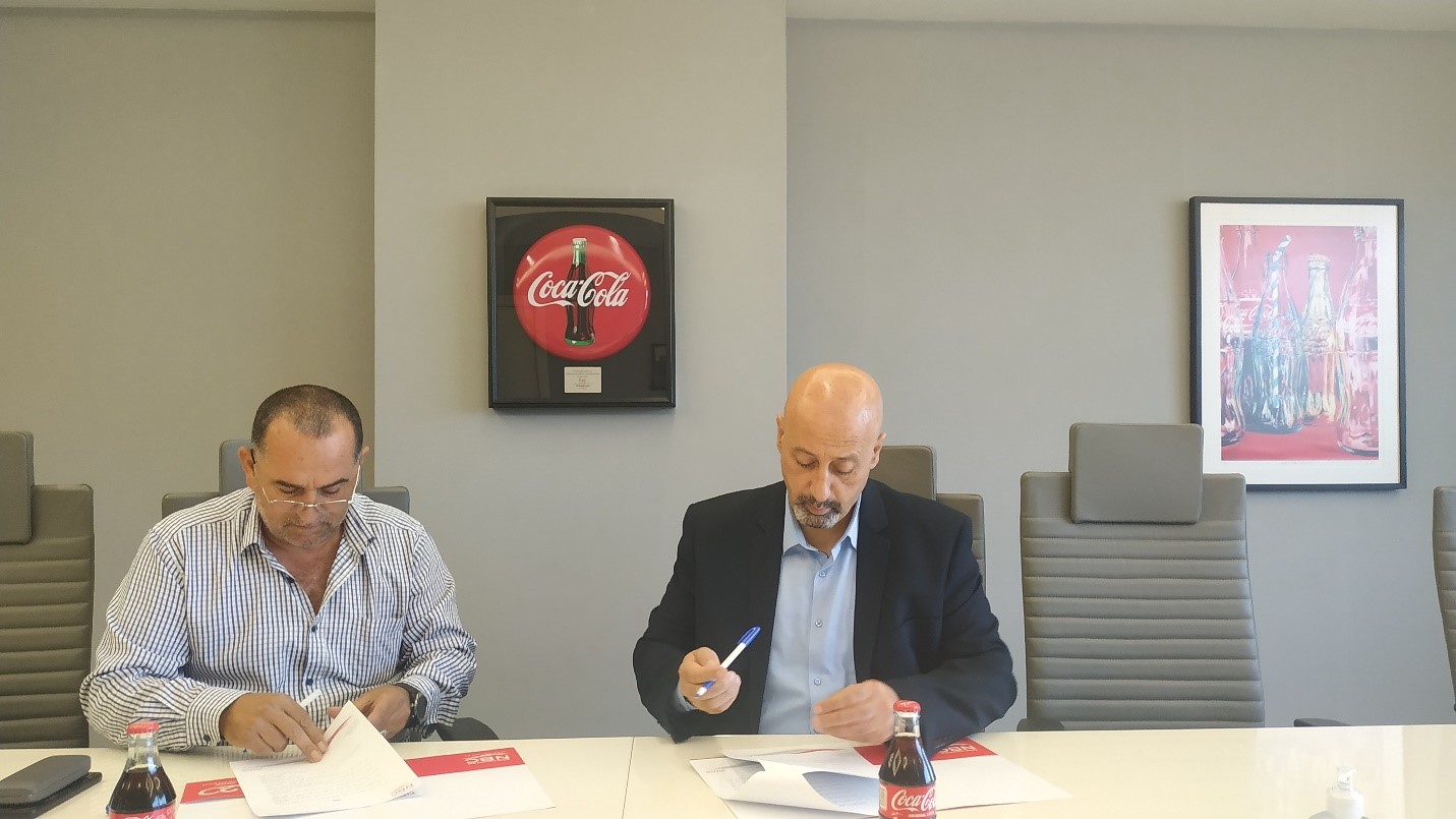 Ramallah- Alhaya Economic – In line with its commitment to support the Palestinian sports, the National Beverage Company Coca-Cola/Cappy (NBC) signed an agreement at its head office in Beitunia to support the junior and youth football team of Burj Alluqluq Social Centre Society. The agreement was signed by Mr. Imad al-Hindi, General Manager of NBC and Mr. Nasser Gaith, Chairman of the Board of Directors of Burj Alluqluq Social Centre Society, in the presence of Mr. Montaser Idkeidek, Executive Director of the Society, and Mr. Alaa El Esawi, NBC Technical and PR Coordinator.