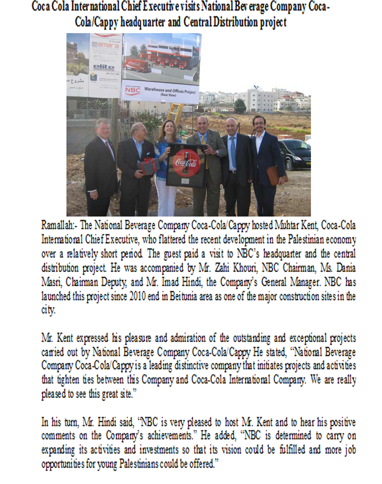 Coca Cola International Chief Executive visits National Beverage Company Coca-Cola/Cappy headquarter and Central Distribution project